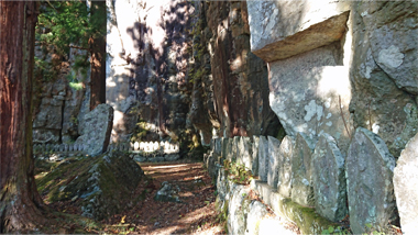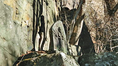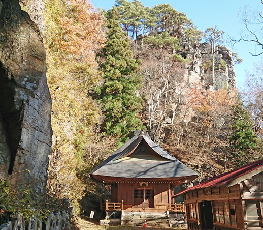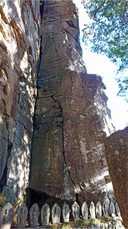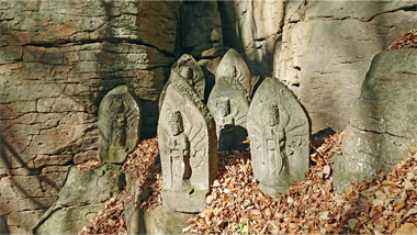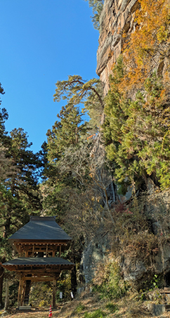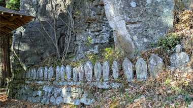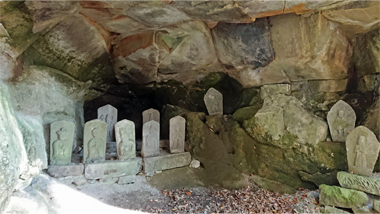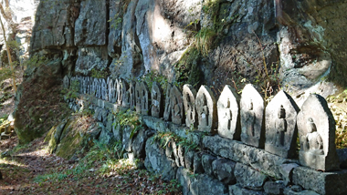 岩壁の合間を下ると観音堂です。そこは約30mの絶壁の真下で、百番観音などの石仏が並んでいます。